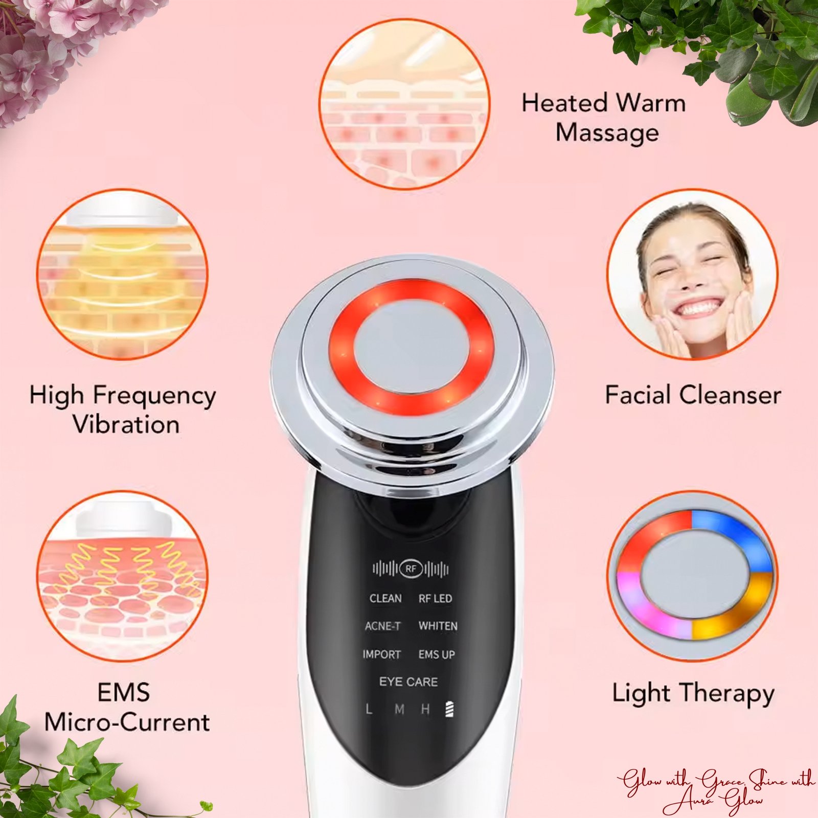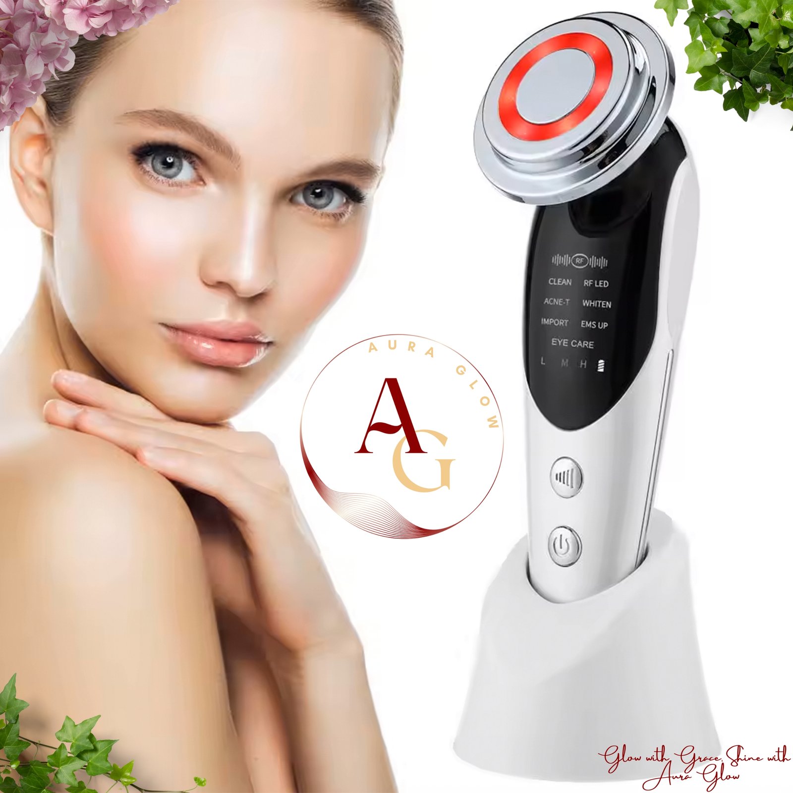 Introducing AuraGlow’s Revolutionary 7-in-1 RF and EMS Rejuvenation Device – Your ultimate at-home solution for combating signs of aging, enhancing skin elasticity, and achieving a radiant, youthful complexion. This advanced facial massager leverages Radio Frequency (RF) and Electric Muscle Stimulation (EMS) technologies, alongside red and blue light therapy, to provide a comprehensive skincare treatment.